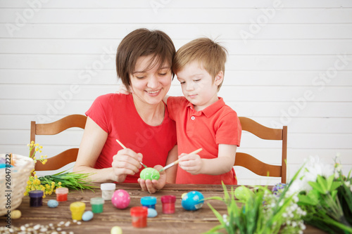 Mother And Her Son Painting Colorful Easter Eggs Happy Family Mom